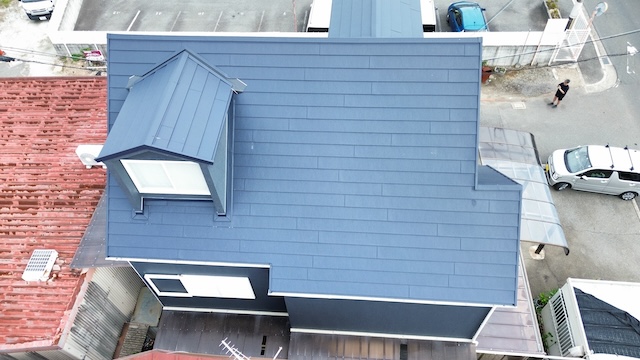 京都市伏見区でドーマーの備わった住宅で屋根カバー工事を実施、施工完了後にドローンで最終チェック