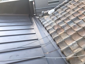 異なる屋根材の接点に雨水が集中しやすい納まり